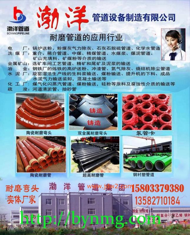 沧州渤洋管道集团有限公司位于中国管道装备制造基地-盐山,北靠京津、天津港,东临205国道、黄骅港、西靠京沪、京广高速公路。公司座落在河北省盐山县蒲洼工业区,占地130000平方米。公司是专业生产电厂洗煤厂专用耐磨弯头、耐磨管道,陶瓷复合耐磨管,双金属耐磨管,超高分子量聚乙烯耐磨管,衬塑管道,陶瓷铠装耐磨管,陶瓷贴片耐磨管,自曼燃陶瓷耐磨管等以及各种材质耐磨管件耐磨材料的集团化产业公司。本公司拥有先进的生产工艺,生产设备和试验检测系统.公司具备管道工程测量、设计、生产、安装能力和完善的售后服务体系。联系电话:13483814869微信,企业网址:http://www.bynmg.com 邮箱:1981546698@qq.com