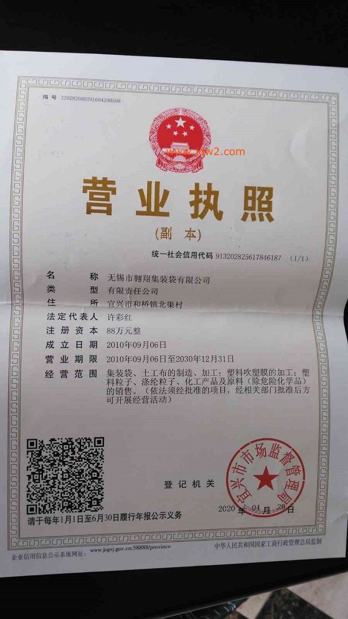 证书介绍 无锡市翱翔集装袋公司始创于1982年,是专业生产集装袋、吨袋、FIBC、软托盘袋等塑料包装袋的企业。主营生产:集装袋、吨袋、防水集装袋、导电集装袋、防静电集装袋、吨包袋、污泥集装袋、纸浆吨包、炭黑包装袋、软托盘袋、太空袋、洁净集装袋、土工布、FIBC等塑料包装袋类制品。联电:0510-85874165,QQ:123130154,123130154@qq.com;www.fibcton.com。集装袋(吨袋、FIBC)适用于谷物、粮油、化学工业、冶金工业、医料工业、环保工业等原材料、矿产资源品类货物的装载和运输。无锡市翱翔集装袋公司严格按照国标GB/T10454-2000的要求生产,公司及时进行设备改造以保持生产技术和生产工艺:(1)采用折叠拉丝工艺使基布强度比同类提高了15%以上。(2)使用集尘设备清洁编织基布以满足袋体的清洁要求。(3)采用双针缝合设备从而使集装袋缝合更美观,同时也大幅增加了整体强度。 无锡市翱翔集装袋公司坚持以“诚信为本、质量为先、价格合理”的经营理念和坚持“客户为上”的原则,为广大客户提供高质量的产品、满意的服务。真诚欢迎各界朋友前来洽谈业务!