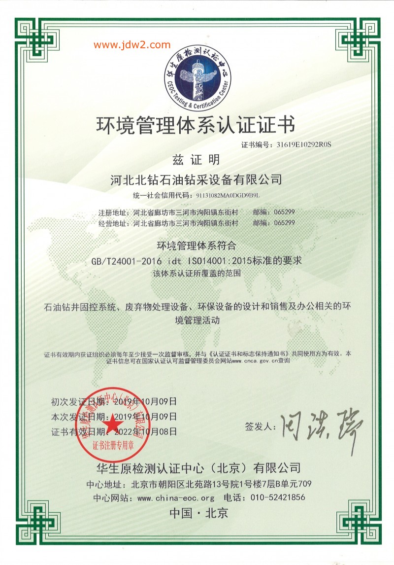 环境管理体系认证证书