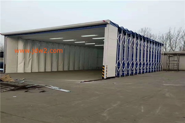 整个伸缩棚由以下几部分构成:门框架、帆布支撑网、剪式伸缩机构、阻燃PVC帆布、驱动机构等部分组成。门框架采用工业型材制成,是驱动电机直接带动的部分,整个伸缩机构稳定运动的关键所在。大门框架上设置有开关按钮并行程开关,用以自动控制大门的伸缩。除去门框,其余部位就是帆布支撑网,是阻燃帆布安装连接的骨架,由多组型材骨架构成,并通过剪式伸缩机构将整个相对独立的骨架连接在一起,形成一个稳定的整体。在每两个帆布支撑网之间,采用剪式伸缩机构相连,其结构尺寸决定了伸缩量,同时为了保证上下都能同时实现伸缩动作,在每侧上下各布置一套剪式伸缩机构,两者之间通过连杆形成一个同步运动机构。在整个网架之间采用工业阻燃PVC帆布,这是形成相对封闭作业间的“墙板”,也是保证空气有序流动的“房体”。安装时每两个支撑网采用一块工业帆布。在喷漆室的大门上安驱动部分。驱动部分采用减速电机,传动到多节长轴上,再由长轴两端链轮同步传动到两侧主动轮上。整个驱动前进、后退采用保护:双向两级行程保护轨道终端设置限位车挡;门柱上边有控制盒,操作方便。