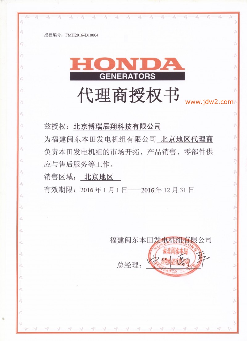 2016年本田授权书由福建闽东本田发电机组有限公司颁发