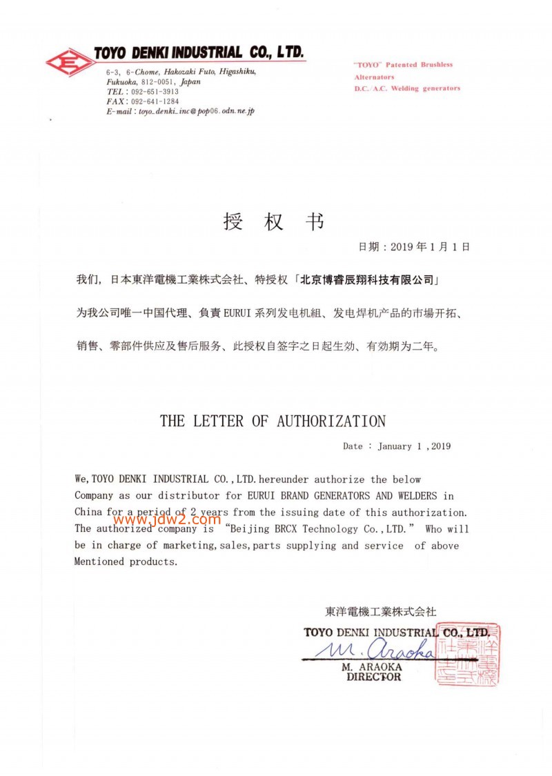 东洋代理证书由东洋电机工业株式会社颁发