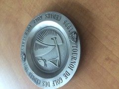 品名:红酒托盘 规格:直径:13.97cm 总高度:0.96cm 材质:锌合金压铸、镀锡 logo:如图,凹刻以及浮雕logo 数量:30,000pcs 包装要求:工厂建议