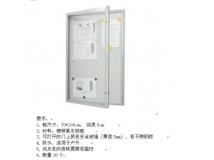 1.框尺寸:70*100cm, 深度5cm 2.材料:镀银氧化铝框 3.可打开的门上装有安全玻璃(厚度5mm),有不锈钢锁 4.防水,适用于户外 浅灰色的背板需要有磁性
