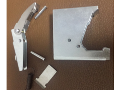 本产品有4个冲压件1个铆钉,2个销子,1个拉簧,具体尺寸分别为:产品1外壳43.5*41.5*12mm,材料厚度1mm冷轧板,产品238*11*8mm,材料厚度1mm冷轧板,产品334*9*7mm,材料厚度0.6mm不锈铁,具体报价后再告知详细尺寸