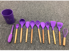 外贸定制-12件套硅胶木柄厨具,刷子,漏勺,汤勺,铲子,抹刀,饭勺,面勺,漏铲,打蛋器,汤勺,食物夹,收纳桶。此单为出口单,需要工厂价格合适配合。