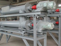 螺旋给料机的工作原理:是利用旋转的螺旋将被输送的物料沿固定的机壳内推移完成输送工作的。头部及尾部轴承移至壳体外,吊轴承采用滑动轴承设有防尘密封装置,轴瓦一般采用粉末冶金,输送水泥采用毛毡轴瓦,吊轴和螺旋轴采用滑块连接。管式螺旋输送机又叫螺旋给料机不宜输送易变质的、粘性大的、易结块的物料,这些物料在输送时会粘结在螺旋上,并随之旋而不向前移动或者在吊轴承处形成物料的积塞,而使螺旋机不能正常工作。管式螺旋输送机的螺旋直径从200毫米到500毫米,共有五种规格,长度从2米到70米,选型时符合标准公称长度,特殊需要可在选配节中另行提出。