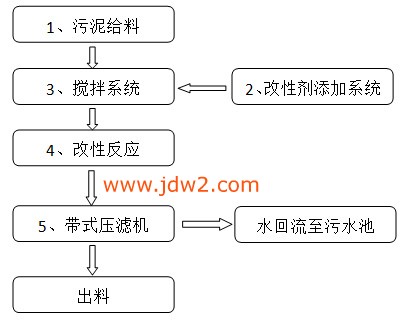 废水处理厂的污泥经泵送入污泥搅拌槽内与高分子凝集剂(polymer)混合作用后,使污泥中细小的悬浮状颗粒经高分子凝集剂的架桥作用形成胶乳(floc)状较大的颗粒,而后以重力流方式由搅拌槽上端溢流入后续的压榨脱水作业。