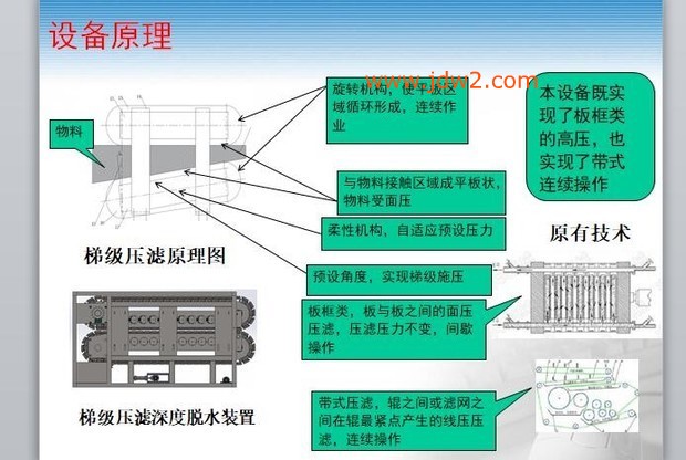 易洁公司生产销售具有连续生产、性能稳定、故障率低、抗腐蚀性强、能耗耗低、处理量大、滤饼含水率低、易操作、易清洁、易维护等优点的节能型带式压滤机。广泛应用于城市生活污水、纺织印染、电镀、造纸、皮革、酿造、食品加工、洗煤、石油化工、化学、冶金、制药、陶瓷等行业的污泥脱水处理,也适用于工业生产的固分离或液体浸出工序。 主要特点: (1)自动调偏及失效报警,双重保护,增加网带使用寿命。 (2)超长过滤网(33米)使设备具有超强污泥处理能力。 (3)由于采用卧式结构,整机高度低(1.7米)。,工人操作、维护、调试极方便。 (4)静态混合器和动态混合器同时使用,药剂和污泥混合均匀充分,节约用药量,污泥絮凝效果好。 (5)优良的防腐防水性能,主传动轴承全密封 产品特性: 1.药剂利用充分,污泥处理量大,运行费低. 2.因整机主要使用大量的不锈钢材及防腐防水措施,防腐性能超群 ,故障大幅低以同类产品,轴承保用三年以上,机架保用五年以上. 3.高度低,外观设计美观,操作维修保养非常方便.