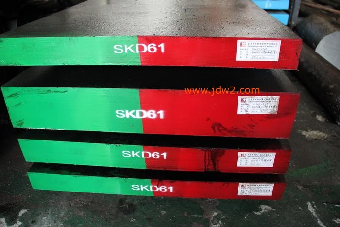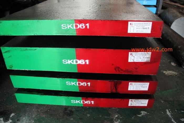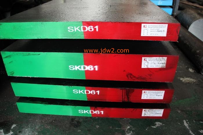 KD61具有良好的韧性与抗高温疲劳性能能承受温度聚变,适宜在高温下长期工作具有良好的切削性能和抛光性能。SKD61经电炉冶炼并经过电渣重熔,钢质更纯净、韧性更好。用途适宜制做铝、锌、铜合金挤压模、压铸模、热锻模、及热剪切刀片等小规格阴亮钢(剥皮、冷拉)材,是制作顶杆、司筒的理想材料 SKD61也适宜制造高产量塑胶模具氮化处理氮化处理可使模具表层获得很好的硬化层组织,对于挤压模具提高耐磨性、抗蚀性,其效果是非常显著的;对于压铸模具氮化处理可显著提高,表面抗蚀性有利于制品快速脱模。