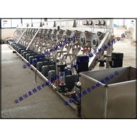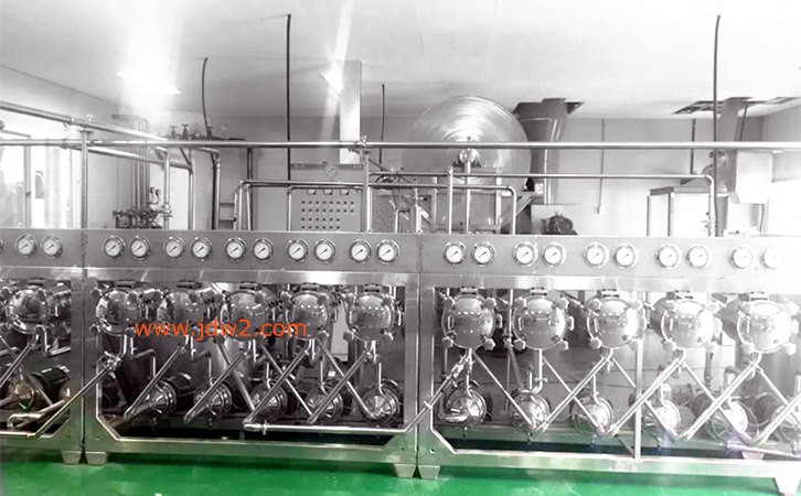 浓缩精制是整条生产线重要的单元,淀粉的品质质量在旋流精制单元得到保障。通过物理的方法将淀粉浆中的杂质彻底出去,使其不影响淀粉产品的质量。 从一级离心筛出来的淀粉浆进入16级浓缩旋流洗涤单元,工艺水从旋流站的另外一端泵入以逆流的方式对淀粉进行洗涤。整个旋流站可以分为三个部分,首先淀粉浆通过浓缩旋流站进行脱汁浓缩,浓缩后的淀粉乳进入后面13级洗涤单元,而从溢流出来的细胞液则进入两级回收旋流站对其中所含的淀粉进行回收。从旋流站溢流出来的含大量纤维杂质的废液绝大部分直接外排,很少的一部分仍然进入提取单元的工艺水系统中。从旋流站出来的淀粉乳被泵送到一个带搅拌器的不锈钢淀粉乳储存罐中。 洁净的工艺水从旋流站尾级加入,与淀粉乳混合洗涤,然后溢流又与前一级淀粉乳混合洗涤分离,如此一级一级逆流洗涤使得纤维和细胞液等都随水排出旋流站。采取十三级洗涤能够保证旋流站的洗涤,更好去除淀粉乳中所含的纤维、蛋白等杂质,保证了从旋流站出来的淀粉乳中没有杂质。以此可以保证生产出的淀粉的各项指标都符合标准。
